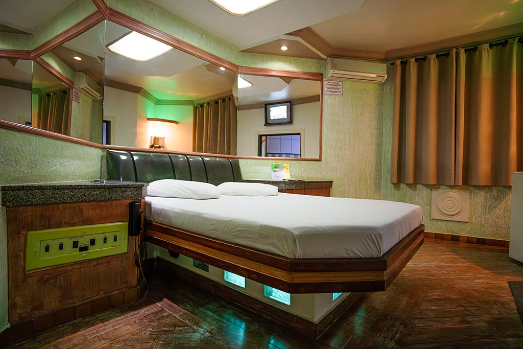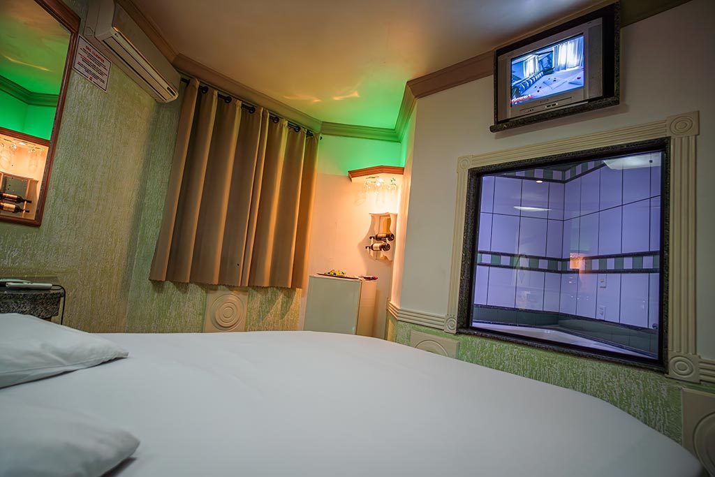 Nosso quarto tipo Apartamento é ideal para quem busca conforto, praticidade e privacidade. Equipado com cama confortável, ar-condicionado, espelho no teto, iluminação decorativa em LED e ambiente climatizado, oferece o ambiente perfeito para momentos relaxantes a dois. Cortinas blackout garantem total privacidade e a decoração moderna completa a experiência.